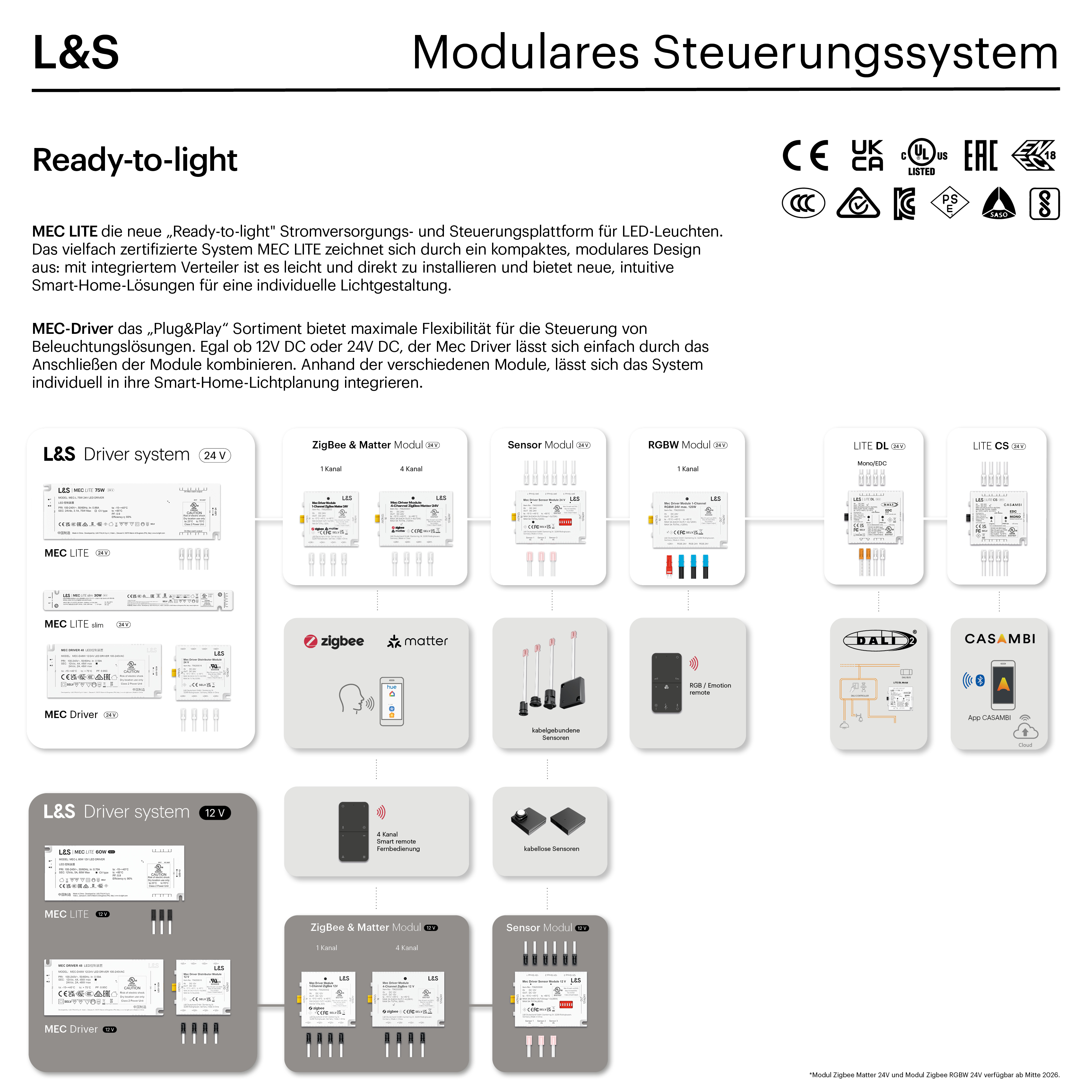 Das neue Steuerungssystem Mec Lite mit Modulen, die mit Bluetooth-, Zigbee- und Matter-Technologien kompatibel sind und personalisierte Beleuchtungsszenarien ermöglichen